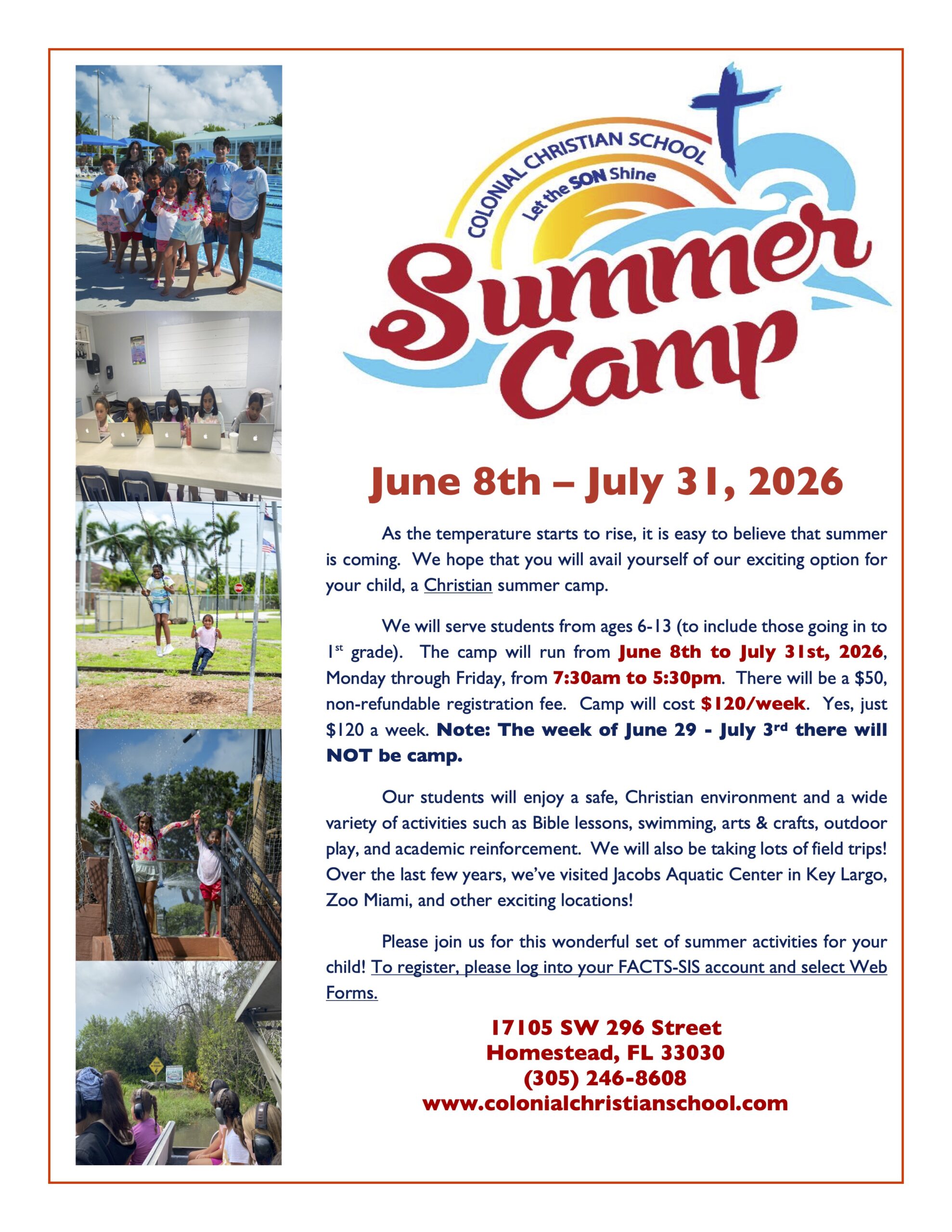 Our students will enjoy a safe, Christian environment and a wide variety of activities such as Bible lessons, swimming, arts & crafts, outdoor play, and academic reinforcement.